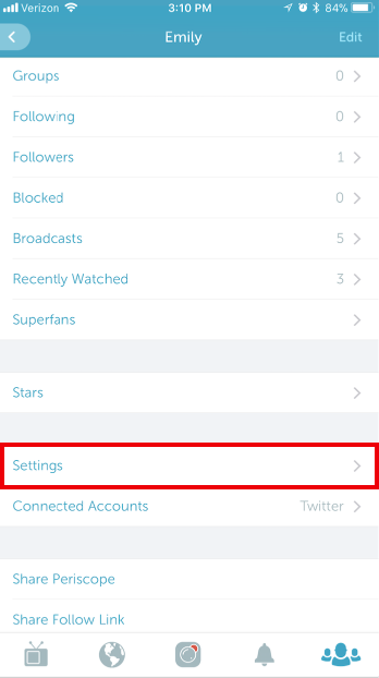 In the Periscope app, navigate to your Profile (upper right corner of the app) and then scroll down and select Settings: